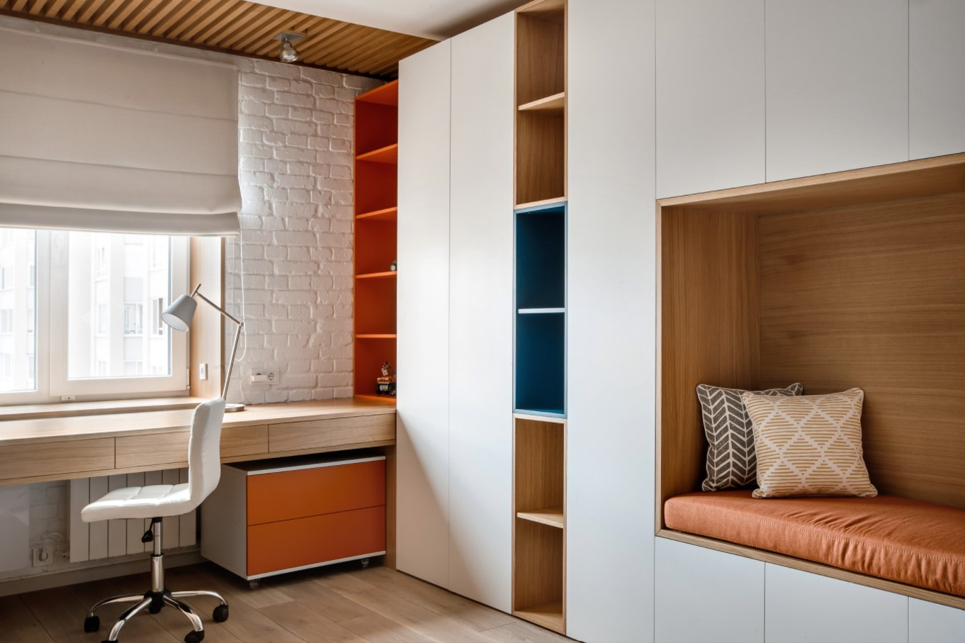 For example, placing a tabletop on a windowsill, many do not take into account that the student simply does not need so much space for lessons. Therefore, instead of a wall-to-wall table, make a table + 1-2 benches with cushions, on which it is comfortable to read books or just relax during breaks.