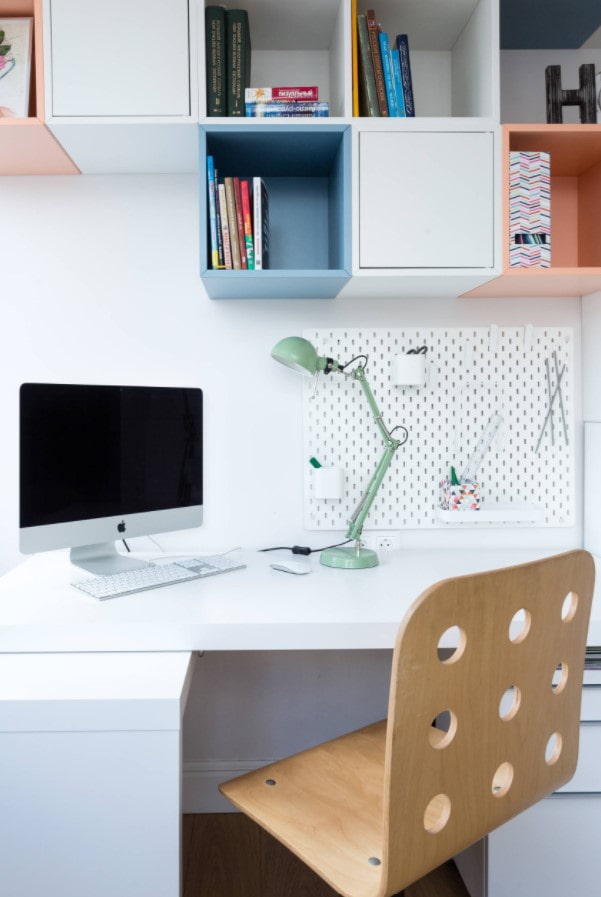 In order for the child to be comfortable doing homework, the tabletop should remain as free as possible. At the same time, access to all necessary office supplies, books, educational materials should remain simple and convenient.
