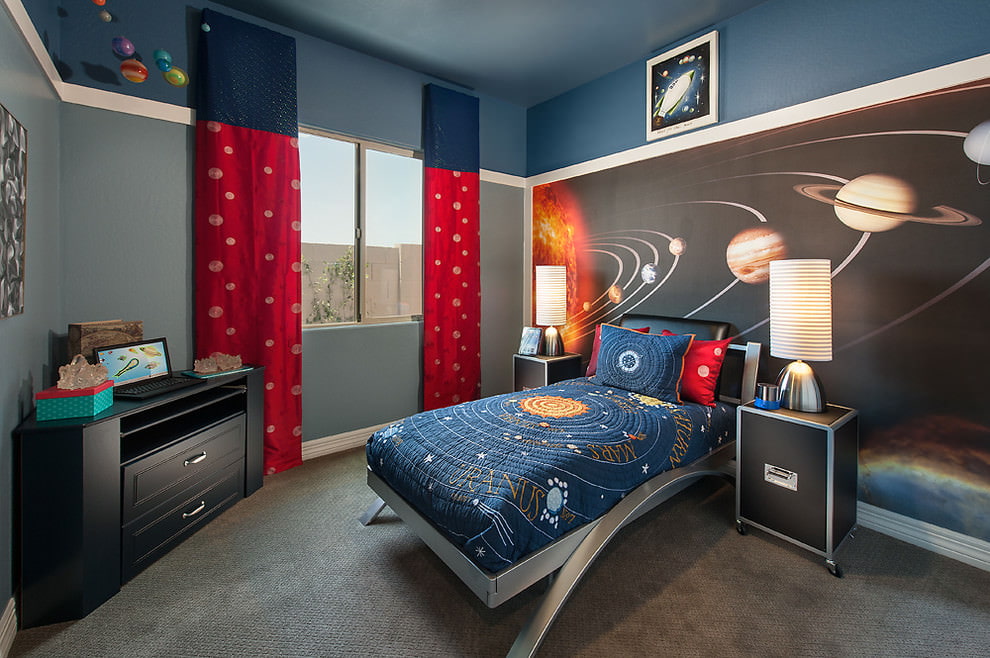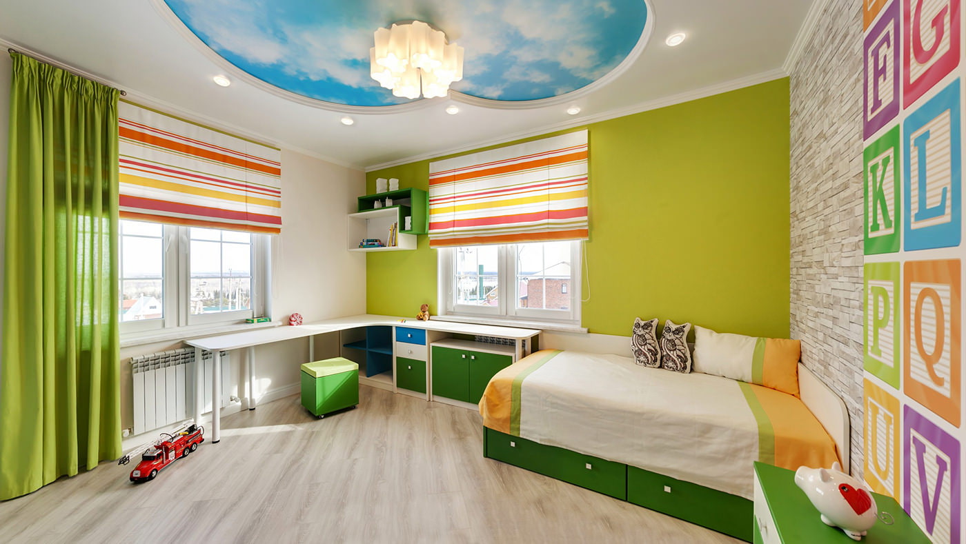 On the picture a teenage kids' room in a modern style, in which roman shades match the color of the furniture.