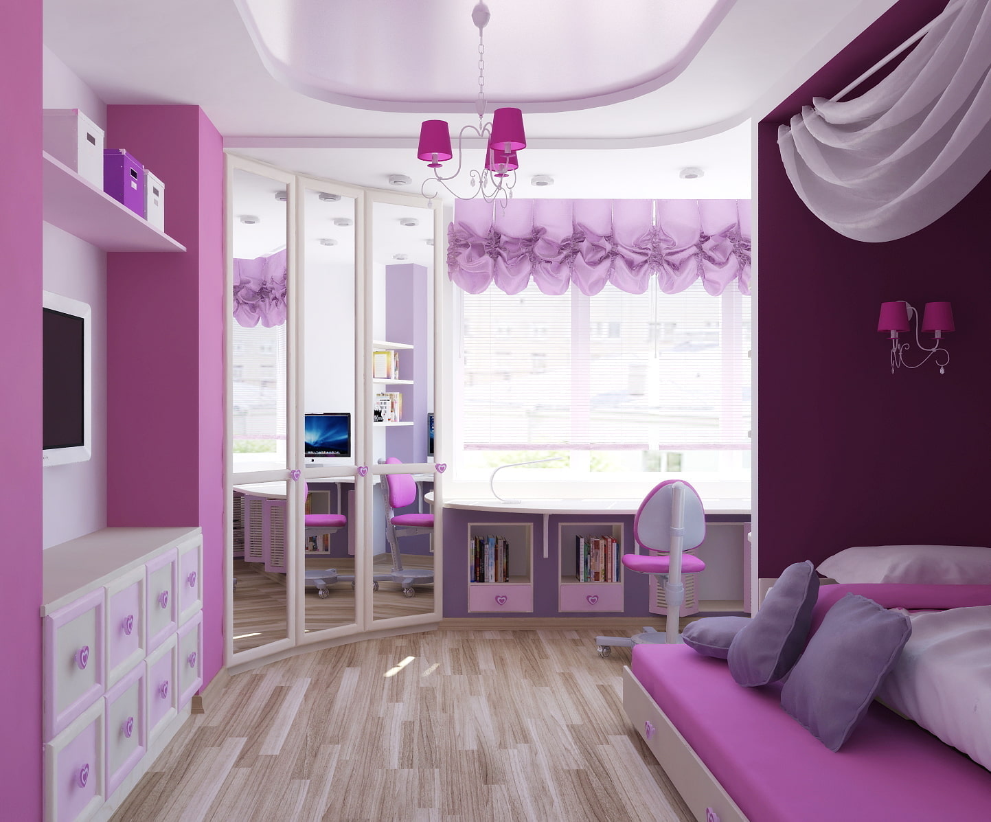 - Pink lilac - gentle, romantic, easy combination for little girls. The main thing is not to overdo it with shades and not make the interior luscious and sweet. If saturated is chosen as pink, then it should be supplemented with pastel, dull lilac.