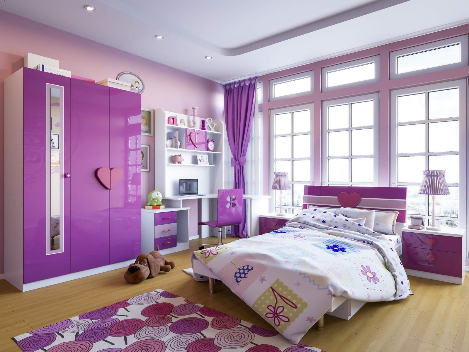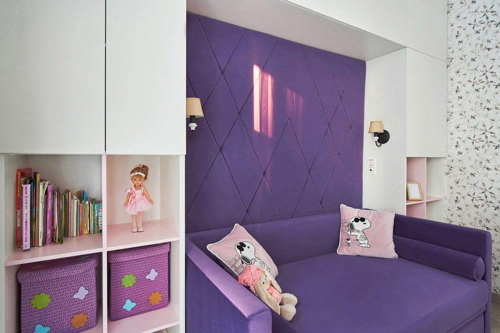 For a children's room, it is better to decorate the walls and ceiling with light blue-violet, lilac, lavender shades, and choose more saturated furniture, some of the textiles. At the same time, the walls should stand out against the background of the floor and ceiling, otherwise all surfaces will merge, the design will be monotonous and boring.
