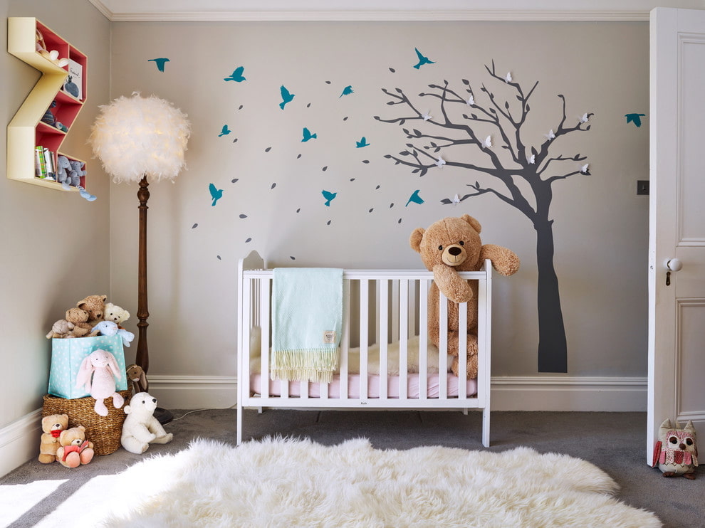 In the photo there is a sticker in the form of a tree on the wall in the nursery for a newborn.