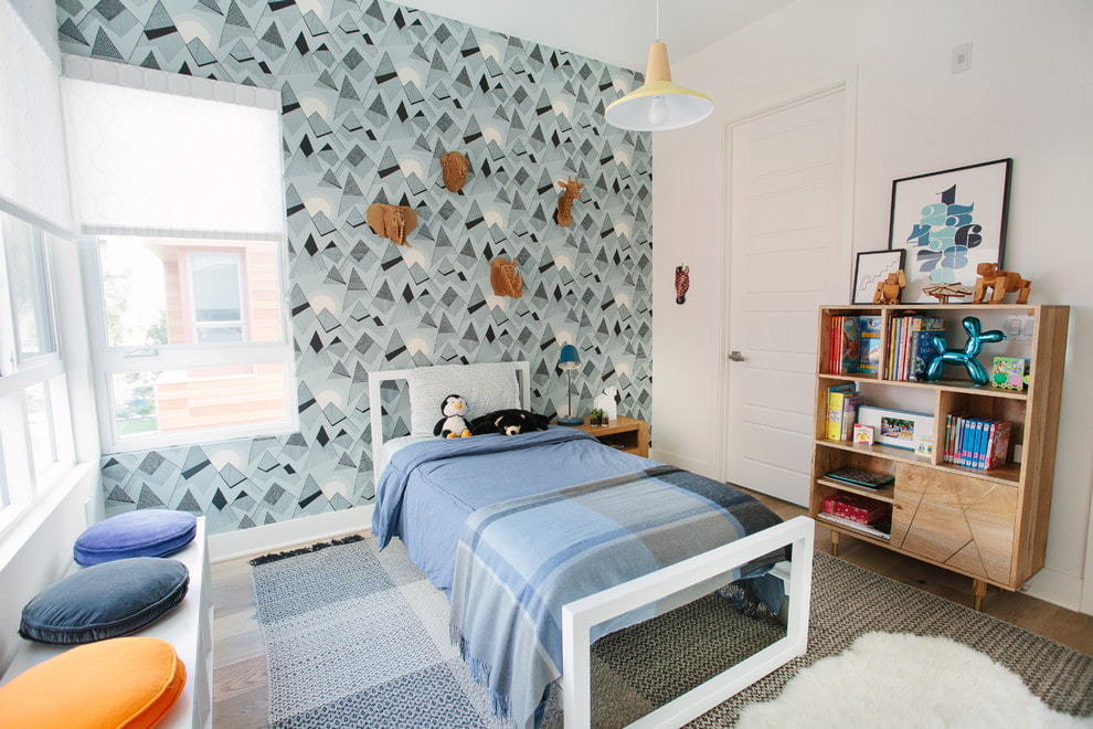 Pictured is a wallpaper with a geometric print on the wall in the nursery in a modern style.