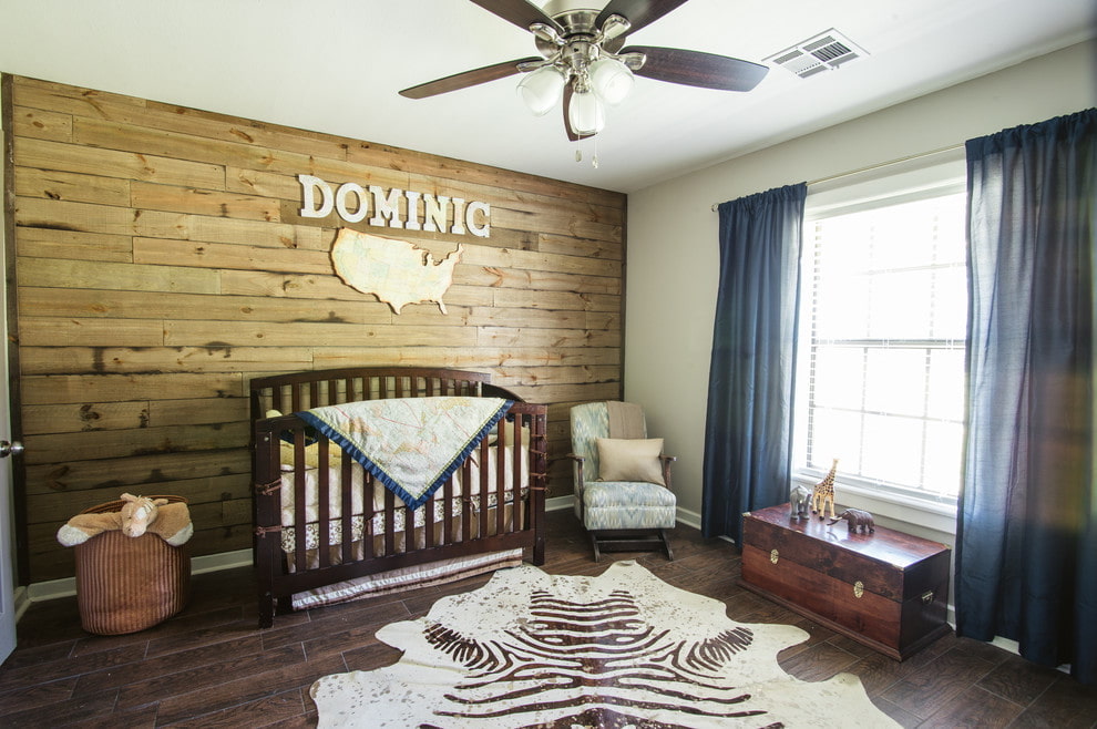 In the photo there are beige walls decorated with applique in the boy's nursery.