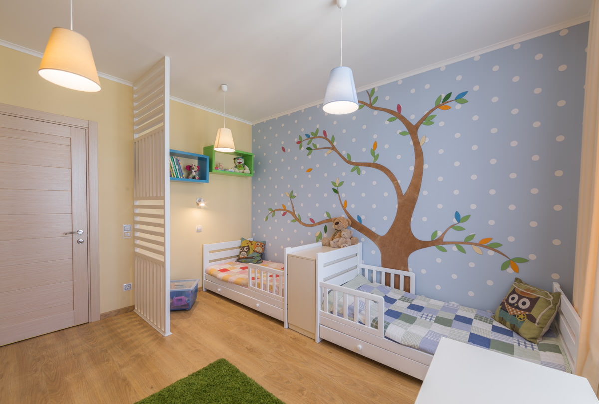 Older children will want to have a separate space, even if not limited by walls. Wallpaper for the nursery of a boy and a girl of various colors will help to highlight such a personal area.You can also emphasize the difference with texture and pattern. For example, decorate “half” of the girl with wallpaper with polka dots, and the boy with stripes.