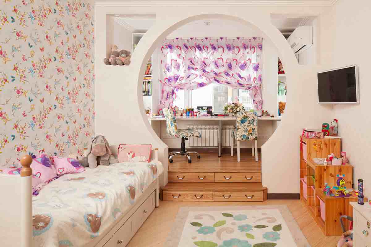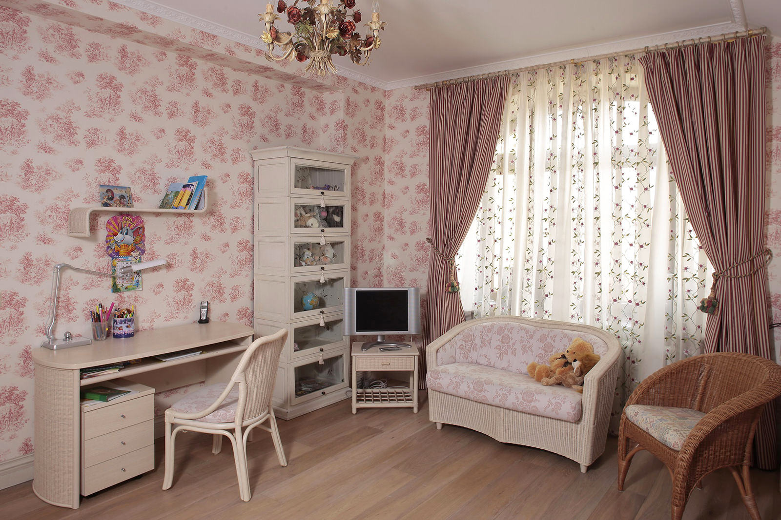 Photo 9. The “princess's” room is covered with delicate pink wallpaper, in the sleeping area the wall is decorated with an image of a stylized castle.