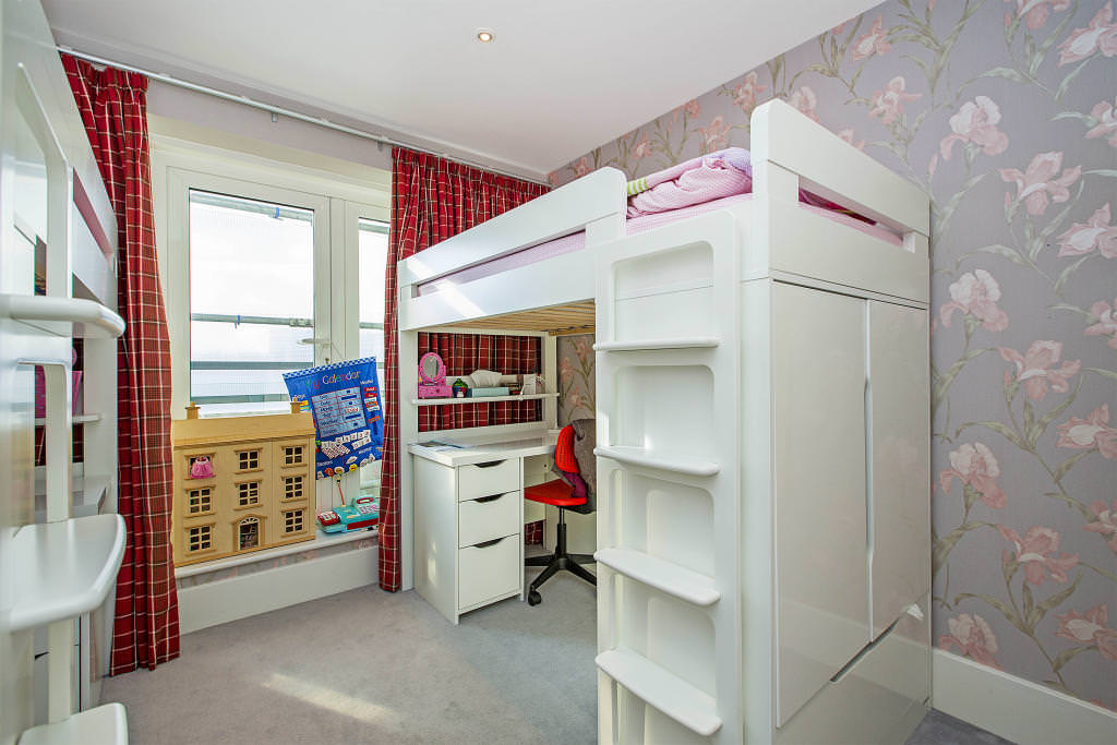 Photo 6. Beige wallpaper featuring a lighthouse and sails helps create a nautical look in the bedroom for two boys.
