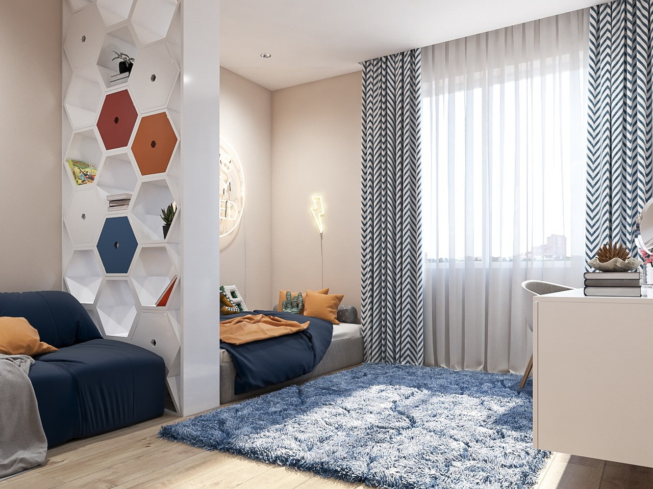 For example, next to and in front of the bed, it is logical to decorate in light, pastel, preferably cold colors - blue, green, gray shades soothe and help to relax. Use blue, dark blue, dark green, yellow near the table for classes - these useful shades help to focus, activate the brain.