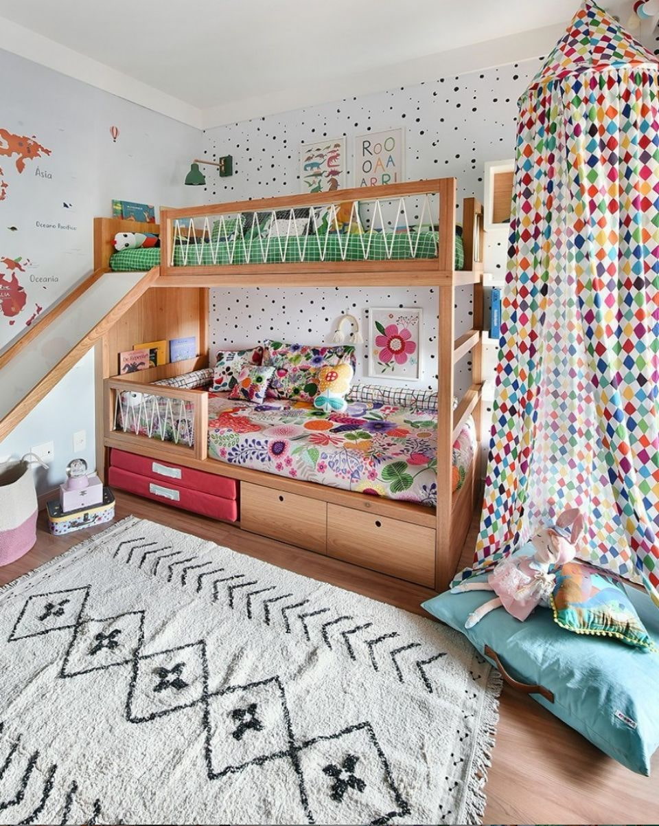One way or another, a children's room is primarily a bedroom. Therefore, the place to sleep in it should be the main focus. Bed is selected based on the size of the room and the number of people living in it.