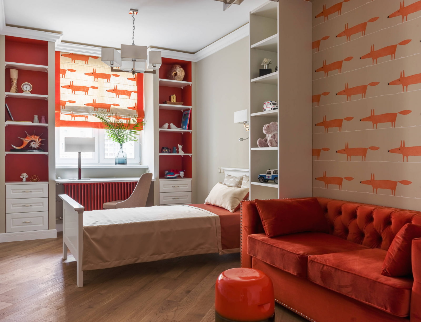 The easiest way to design a room boys or girls about the same age living together. Brothers or sisters will be able to sleep on one bunk bed, do their homework at one long table, and they will also most likely play together with the same toys.