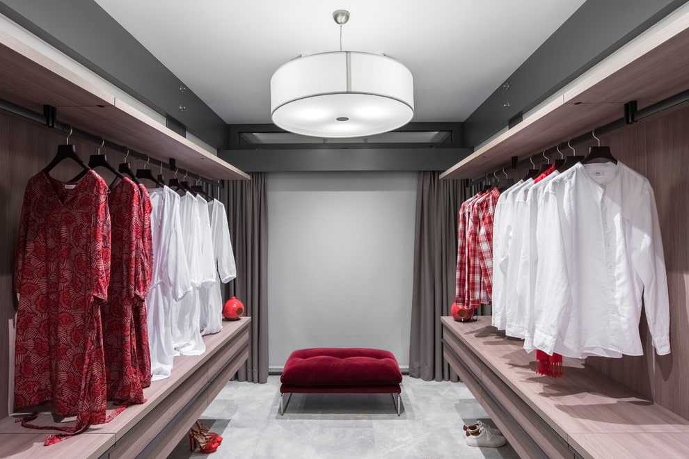 It is a fairly common option for a dressing room. This arrangement provides convenient storage of clothes, which are always in the access zone before leaving the room.