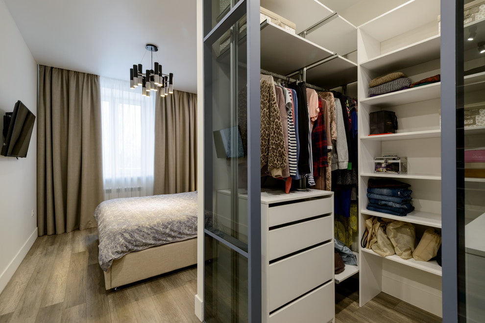 The design of the dressing room simultaneously contributes to the orderly arrangement of things and the preservation of the aesthetic appeal of an apartment or house.