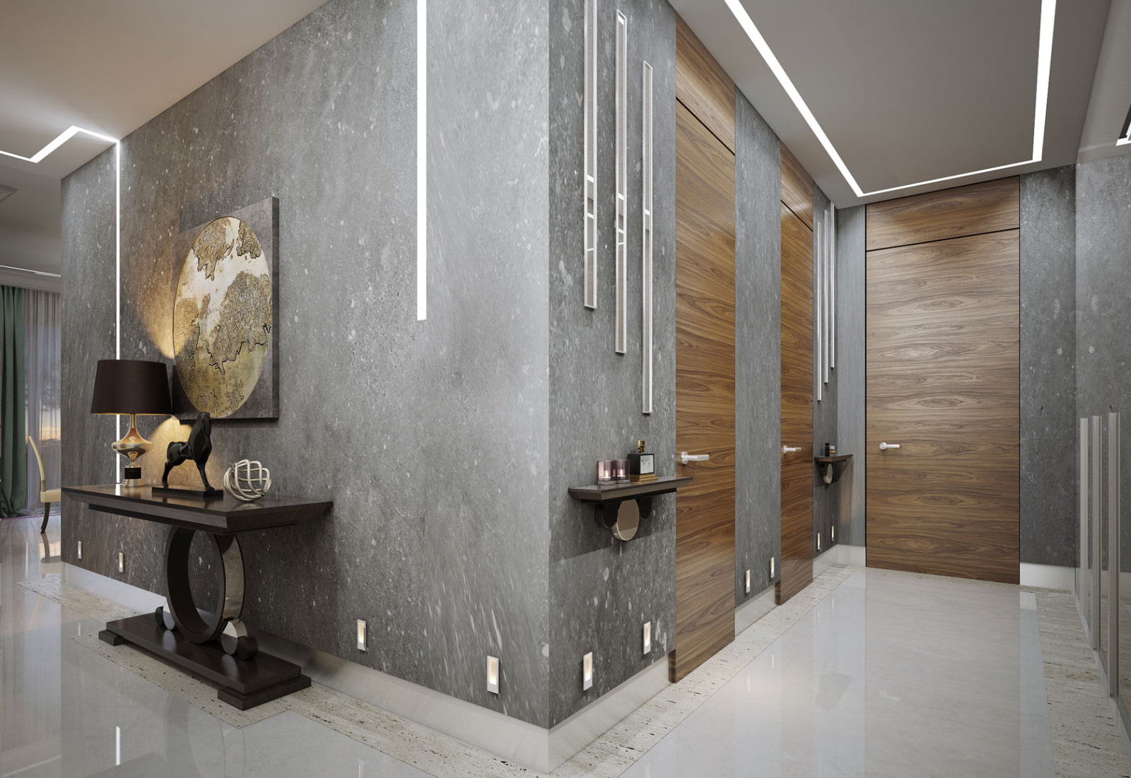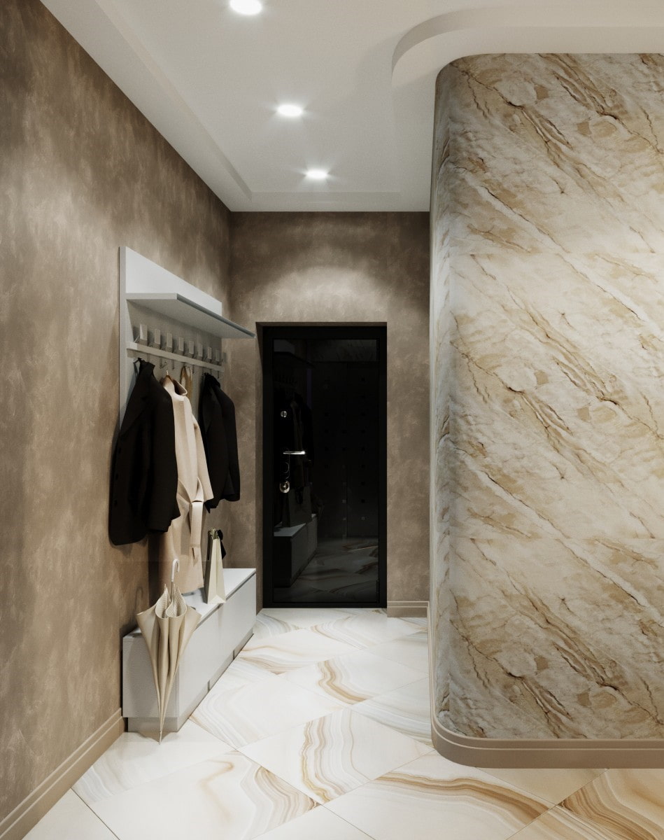 Decorative finishes that faithfully imitate a noble stone can be presented in a wide range of colors. The coating with marble chips reflects the stone texture as accurately as possible and gives the corridor a luxurious and presentable look.