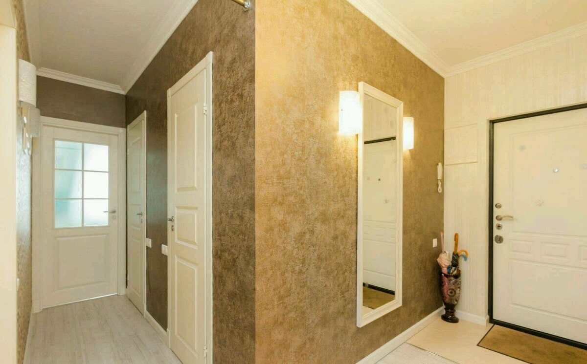 The photo shows decorative beige plaster in the interior of a spacious hallway.