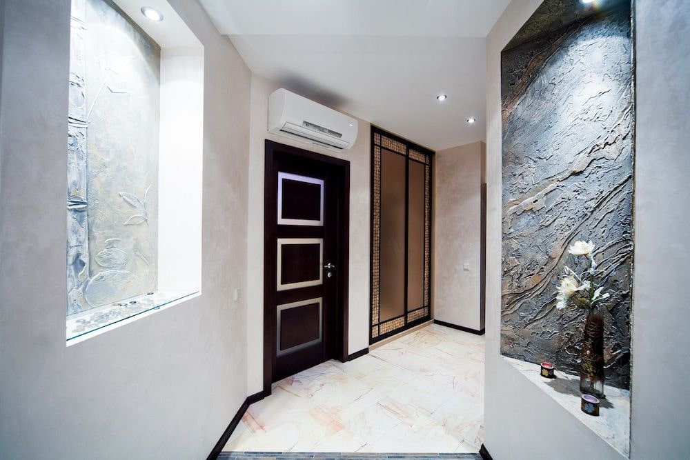 - Due to the lack of natural light, the corridor should be decorated in lighter colors. When using dark shades, the hallway should have the maximum amount of artificial light.