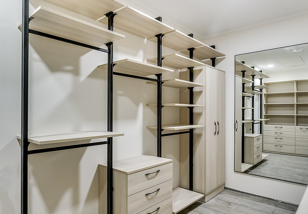 In the photo, a frame structure in a pantry with open shelves, upper and lower rods, as well as a cabinet with drawers.