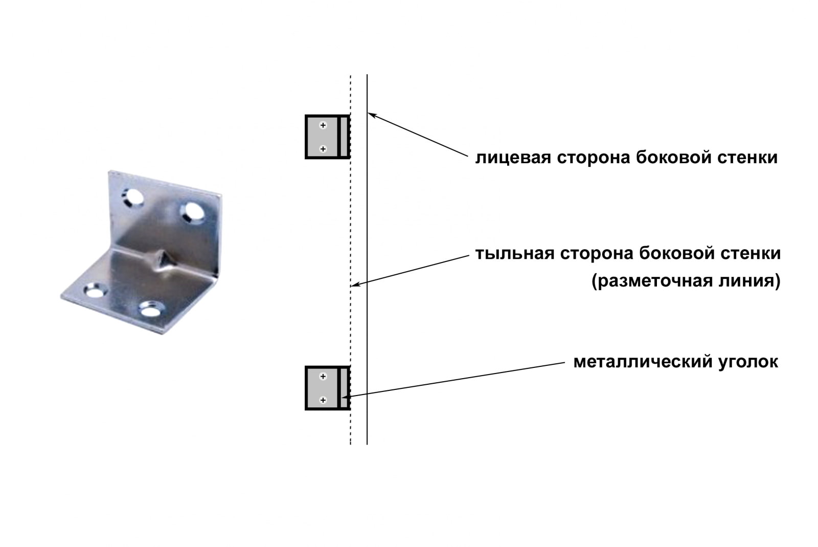 - We fix the sidewalls to the wall. To do this, mark vertical lines on the walls of the dressing room in accordance with the drawing. We fix 5 metal corners along the line at the same distance from each other (we drill the fastening holes, hammer in the dowels, fix the corners with a screwdriver). We install the sidewalls made of chipboard, fixing them at the corners with self-tapping screws.