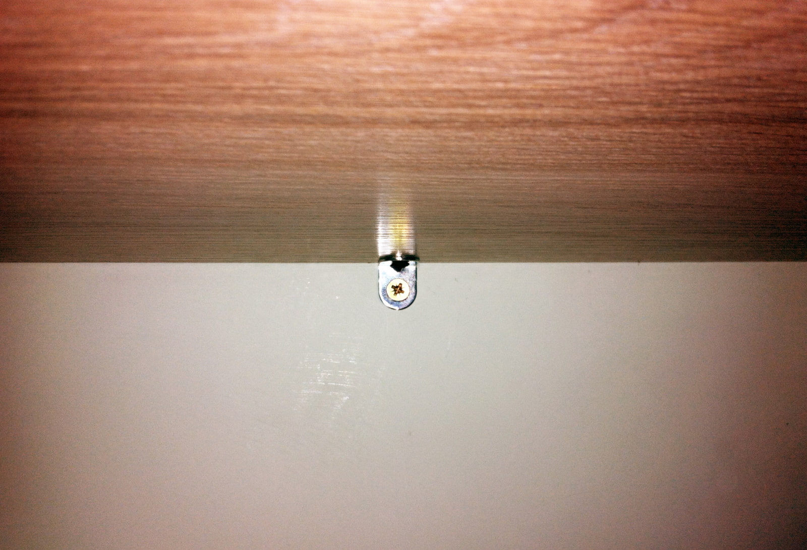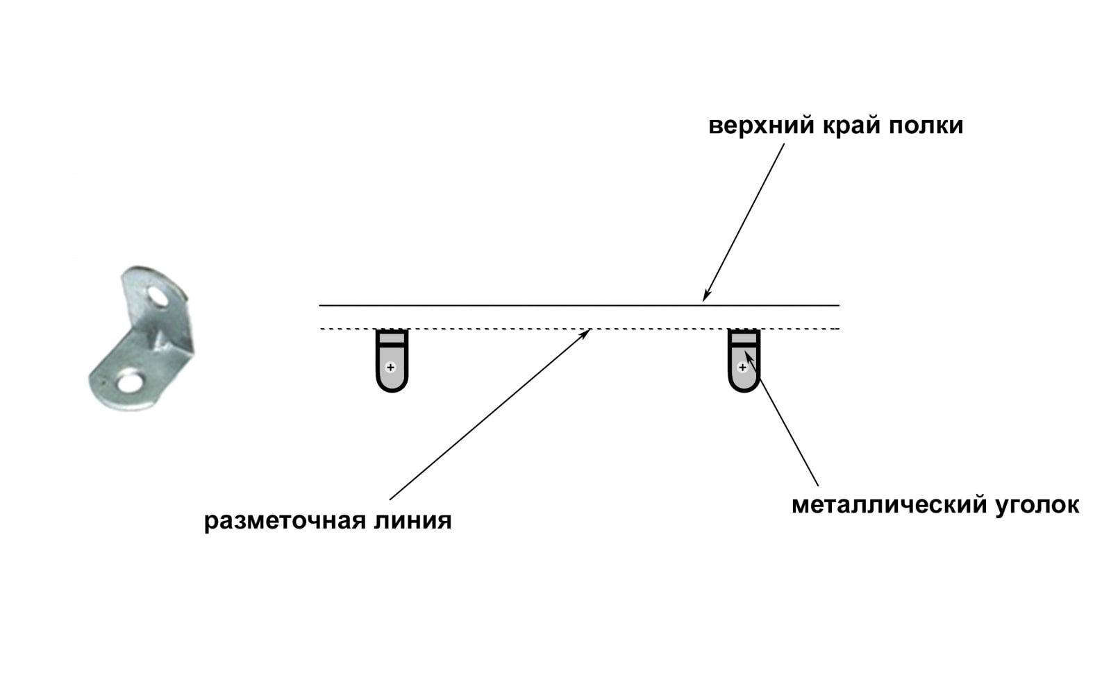 - We make horizontal markings. We fix the shelves with the help of small furniture corners: screws with dowels fix them to the wall, and wood screws to the chipboard.