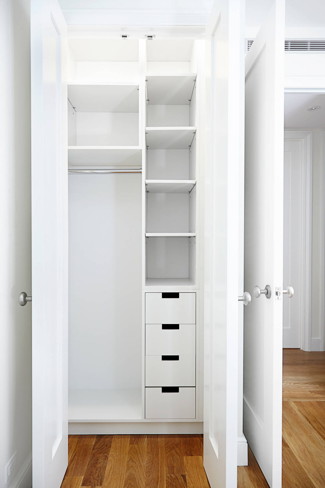 The dimensions of the shelves must be foreseen in advance. It happens that, due to the large number of things, the standard depth and height are not suitable, then it is worth considering the dimensions of the previous storage location.Did you have enough shelves for your clothes? Did the bulky items fit? It might be worth adding hooks or open shelves to accommodate the entire family's wardrobe.