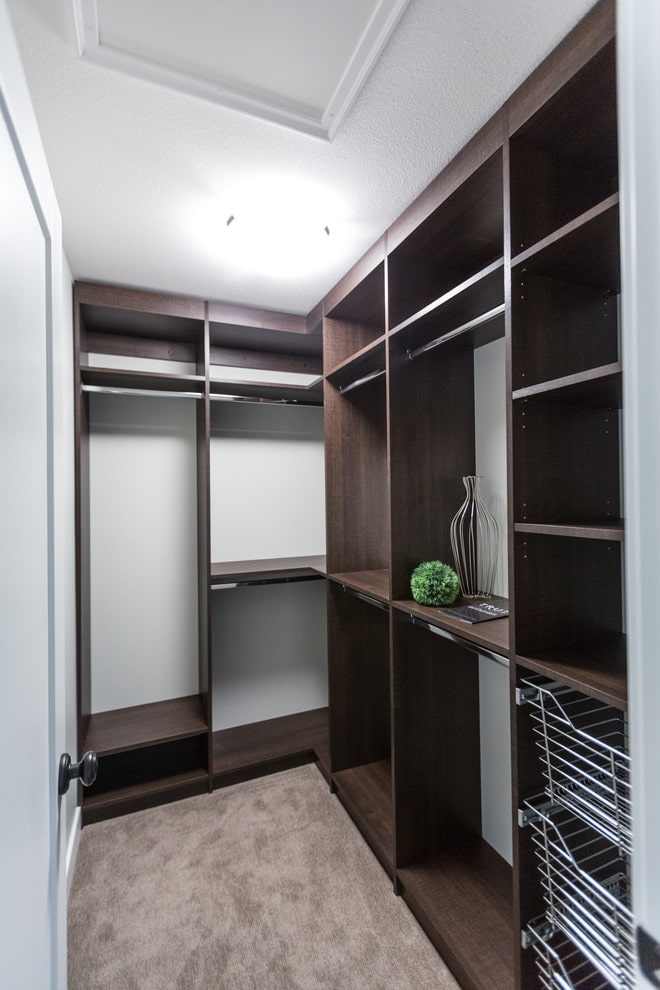 If the pantry is long, then it is best to arrange the storage systems in the shape of the letter "L".In addition to clothes and shoes, you can store larger items in it: travel bags, clothes dryer, bulky boxes or bags with seasonal items. The width of the shelves should be such that a narrow distance remains for passage to the far corner of the dressing room.