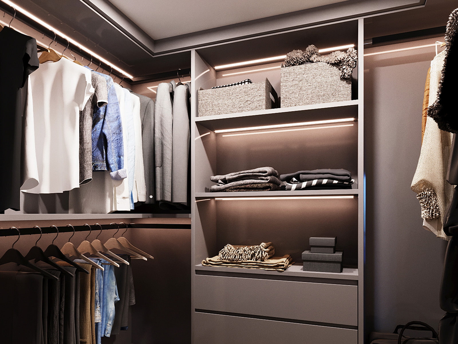 The backlit wardrobe from the closet is a completely different level of convenience than a small semi-dark room. Thanks to the light, using the dressing room becomes much easier and more enjoyable. One of the most budgetary options is an LED strip with automatic switching on when a person moves. LED lamps are very bright, safe for confined spaces, and easy to install in any convenient location.