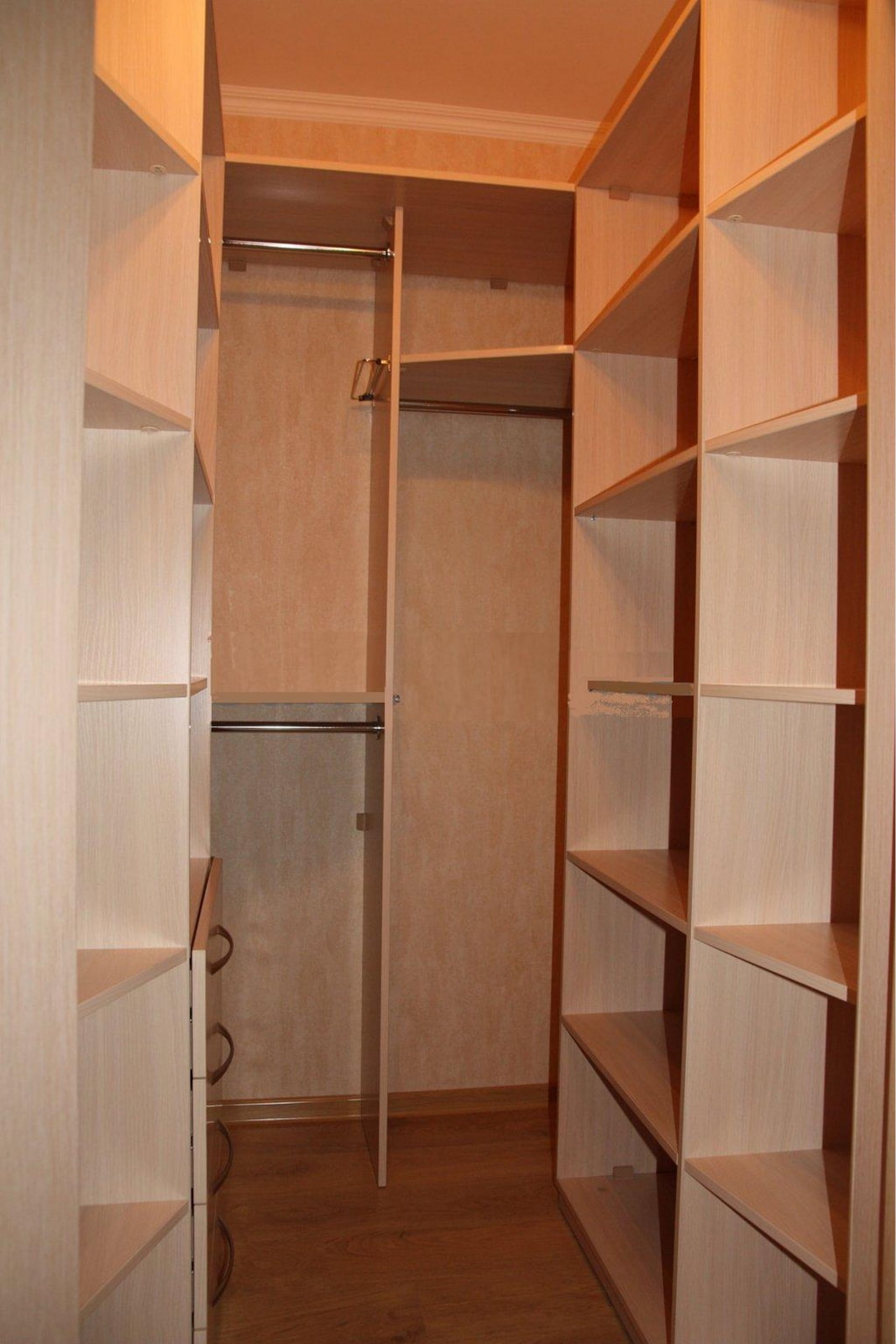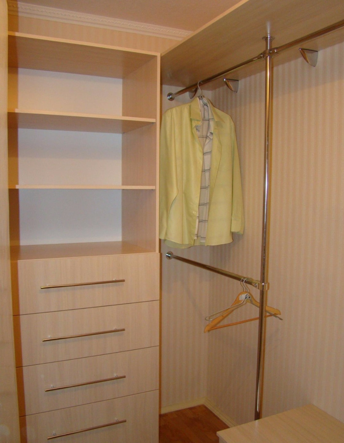 The disadvantages include a small capacity, but if no more than 2 people live in the apartment and there are not a lot of things, a linear dressing room is ideal.