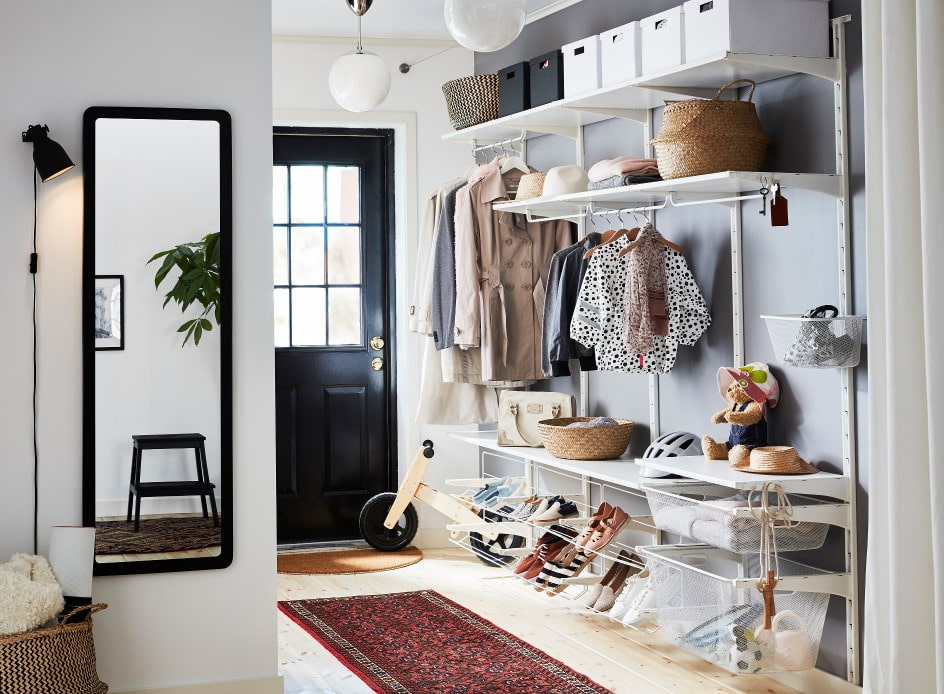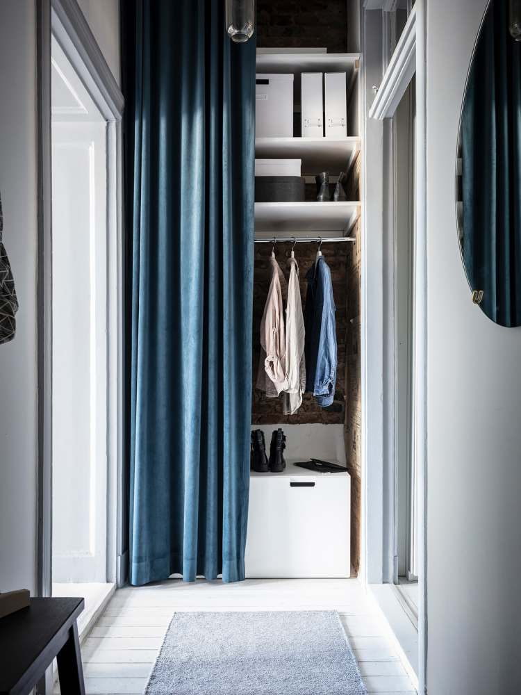There is a mini wardrobe, which is a compact open structure for storing the most essential things, which is mainly located near the entrance. A small dressing room in the hallway includes elements in the form of a shoe shelf, hangers or hooks, as well as shelves for hats.