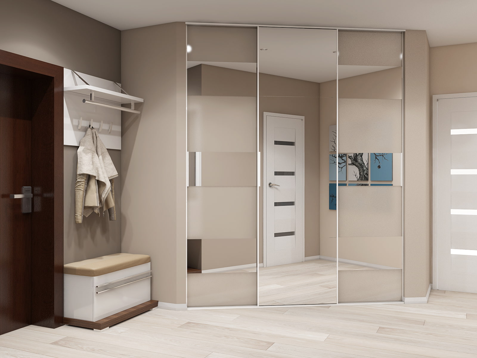 In the photo there is a corner wardrobe in the design of a modern hallway.