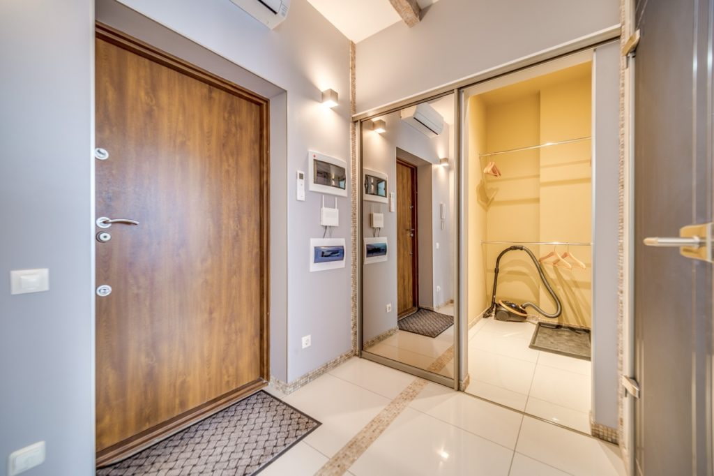 The photo shows the interior of a narrow modern hallway with a wardrobe closet built into the wall.