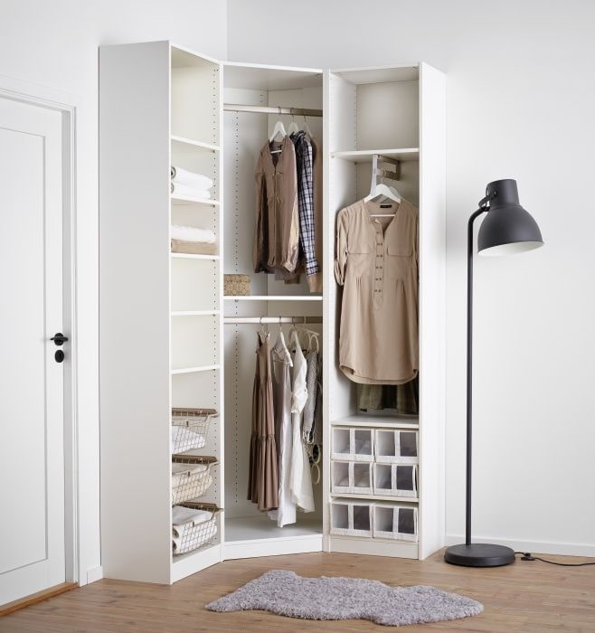 In a small-sized corridor, it will be appropriate to place the structure with an angle.For this, a product in the form of a corner wardrobe or a rack with combined closed and open shelves is suitable. In some cases, the corner can be fenced off with a plasterboard partition and equipped with a doorway in it. This will create an ergonomic triangular wardrobe.