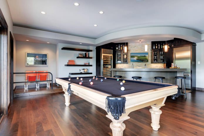 The main functional area of the billiard room is the playroom. Here is a table of the selected size, around it there is a place for players to move, taking into account the length of the cue and the need to swing it. The remaining billiard room space in a private house can be distributed in various ways.