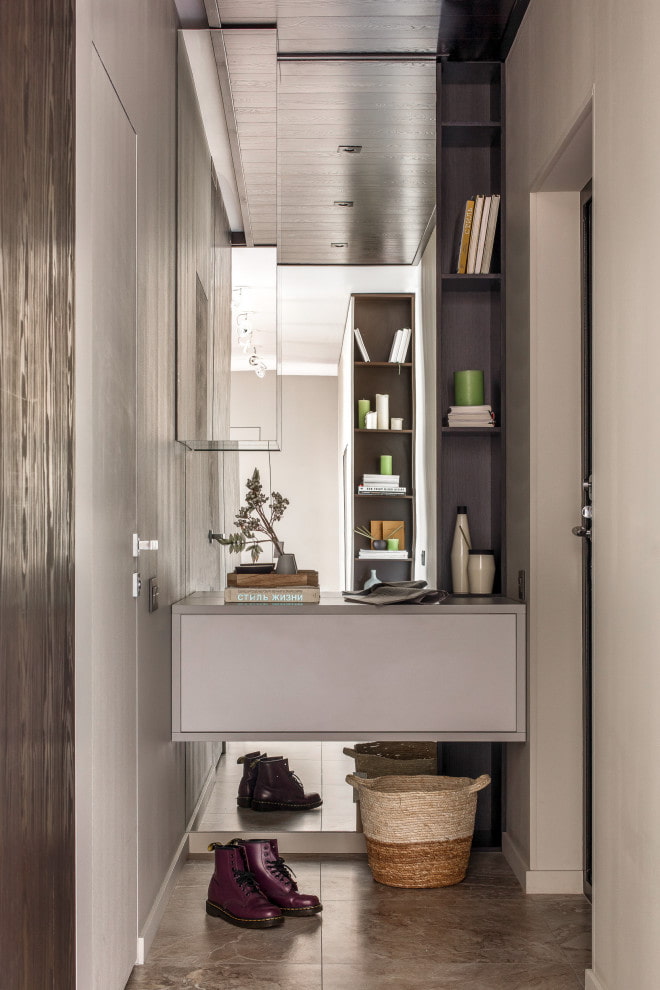 For apartment owners with pantry, dressing room or the storage system in the living room is much easier to reproduce this style, since clothes and shoes will be outside the small corridor. Also, minimalism is recreated with neutral colors and furniture with straight lines.