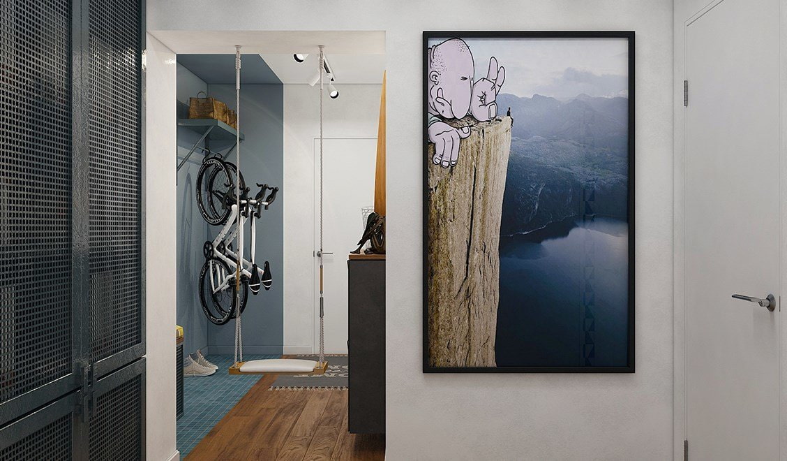 In the photo there is a canvas in a white frame, combined with light furniture in the corridor.