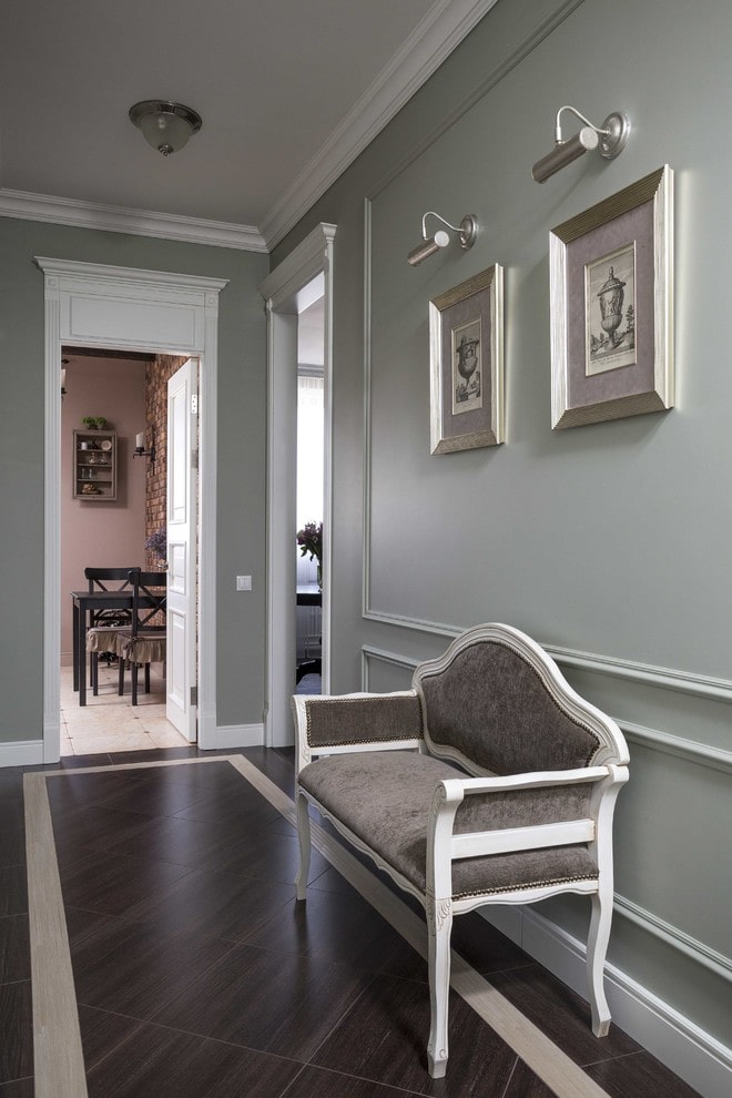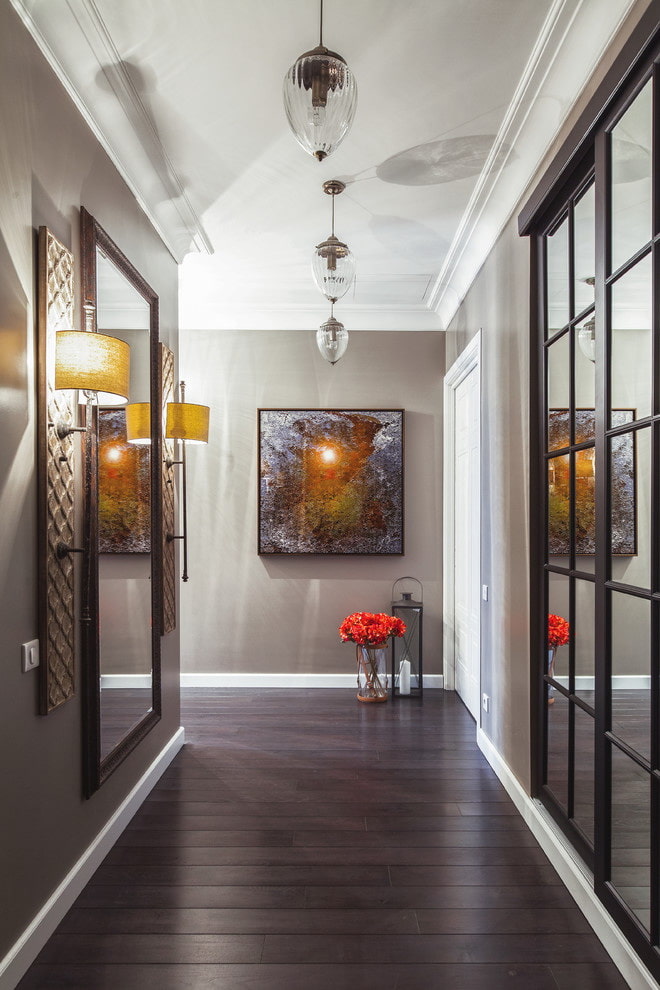 Pictures, with wall lamps located above them, will fill the interior with a play of colors and shades. In addition, the backlight will create additional comfortable lighting for the eyes in the corridor and make its design truly original and attractive.