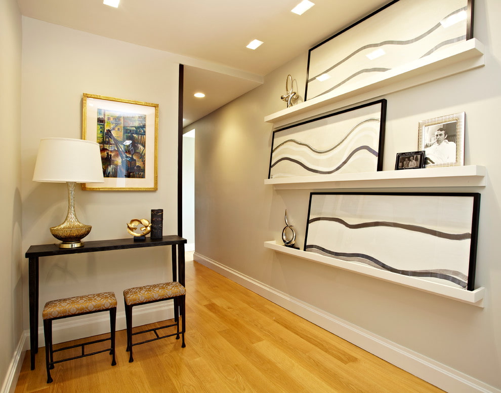 - Narrow. Medium or small canvases arranged horizontally on the walls will help visually expand a narrow corridor. You can also make this room shorter by placing one bright and large picture on one end wall.