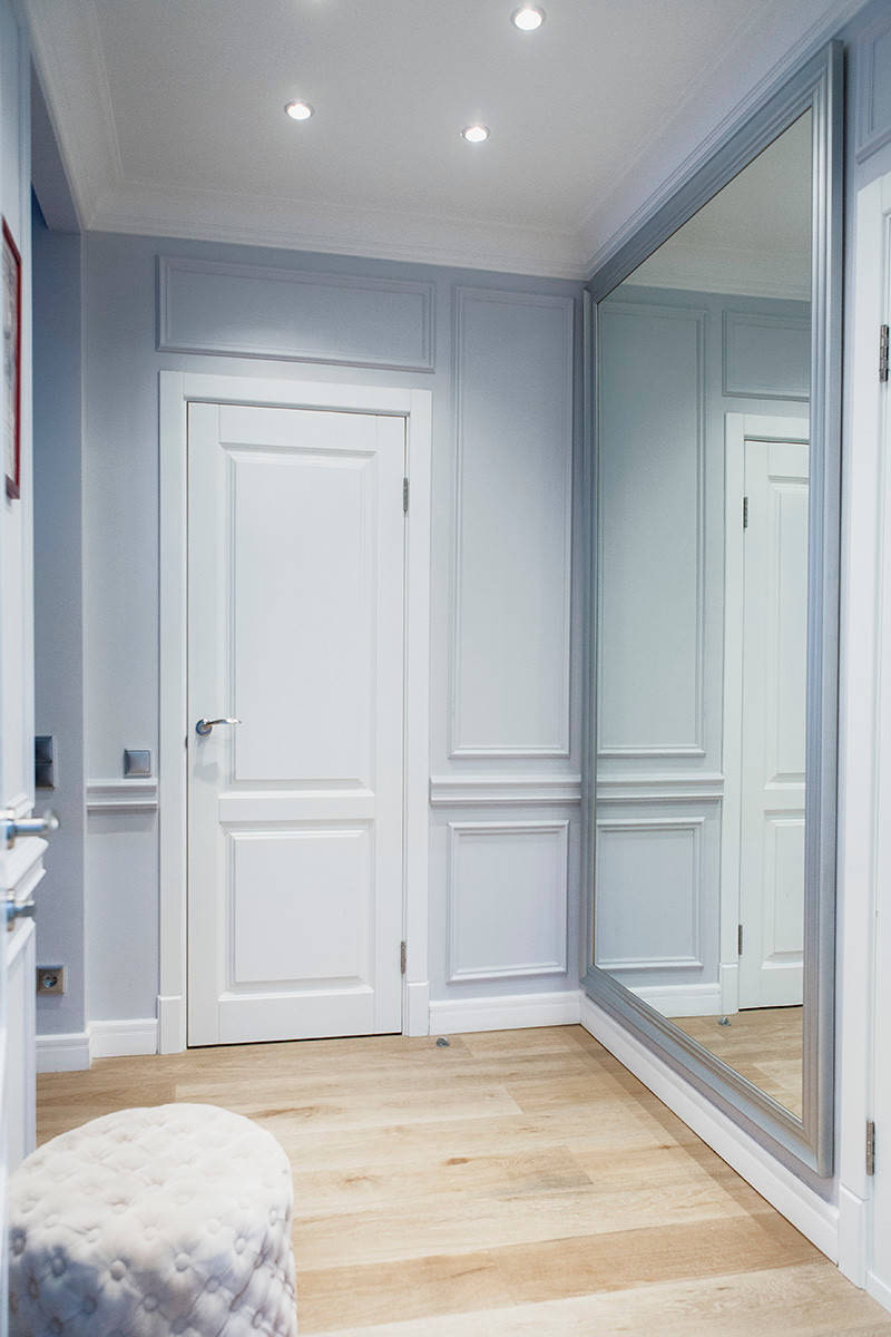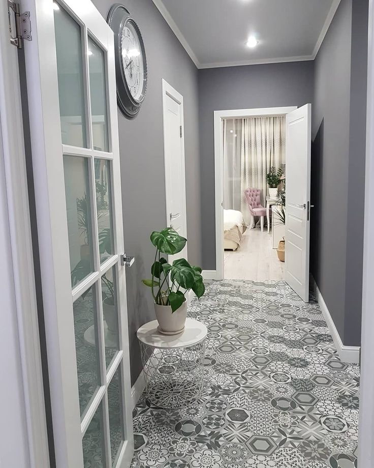 If the flooring is planned to be bright, it is desirable that the rest of the corridor furnishings be neutral, muted tones.
