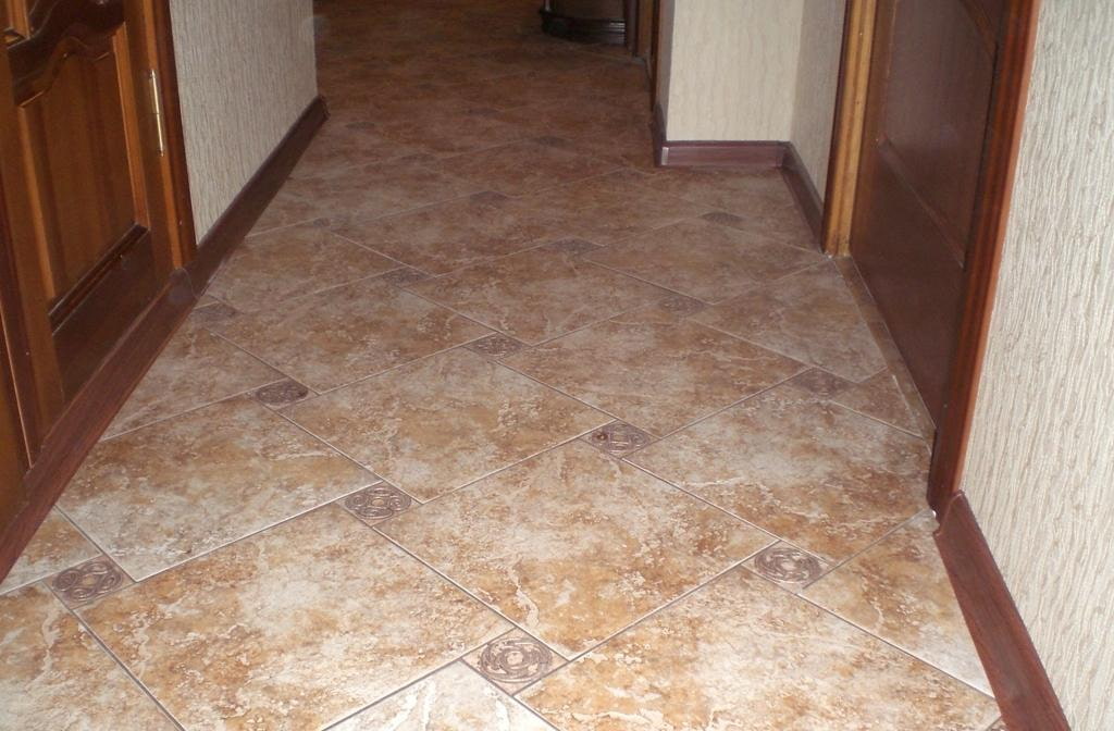 In the photo there is a hallway in a traditional style, decorated with high quality linoleum with imitation of tiles.