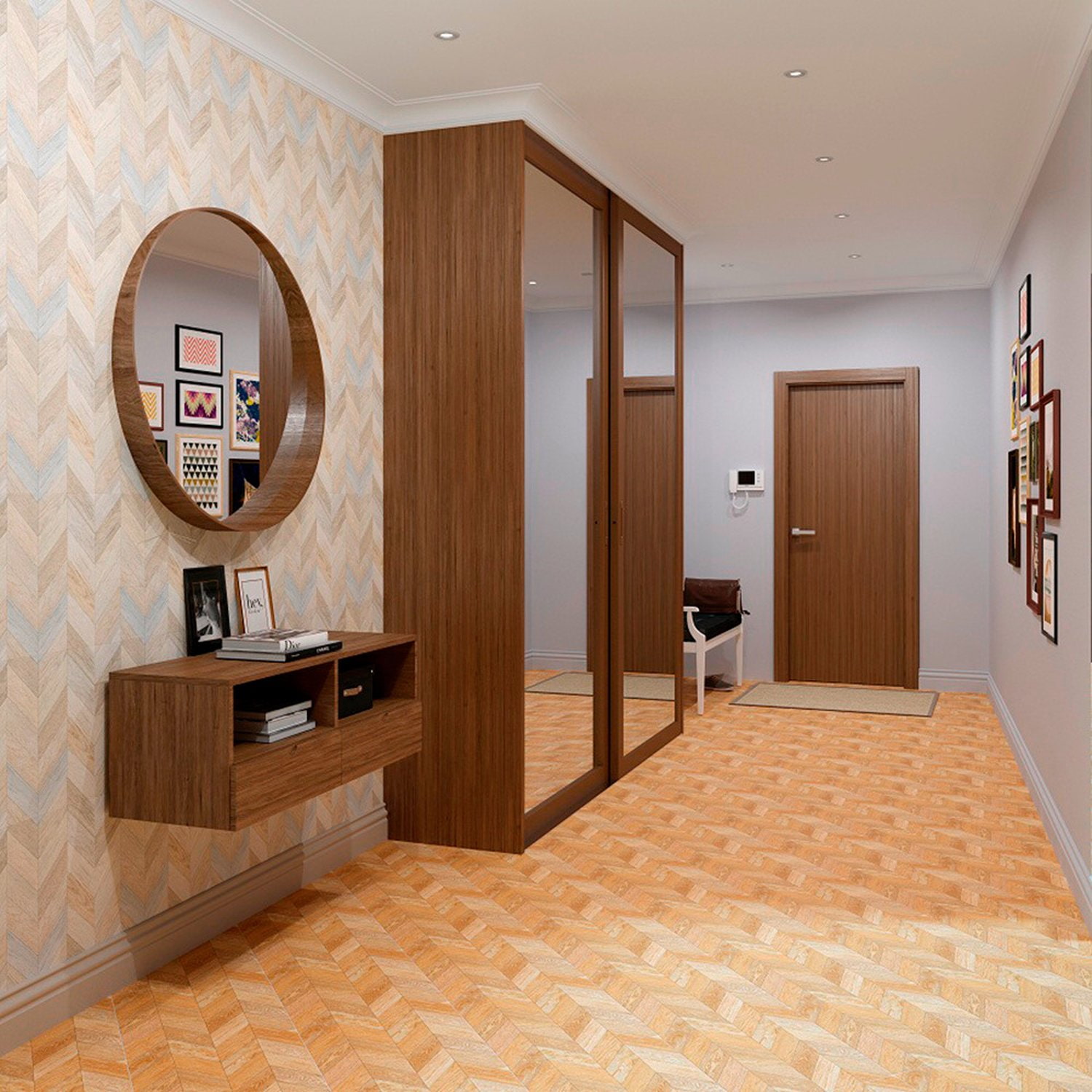 A bright, fancy design for flooring in the corridor is a great solution for creative people who appreciate the originality of the environment. Usually, such linoleum combines several shades; it is difficult to see scuffs and stains on it. Colorful ornaments look especially good in the company of plain walls, and geometric patterns fit well into a strict setting.