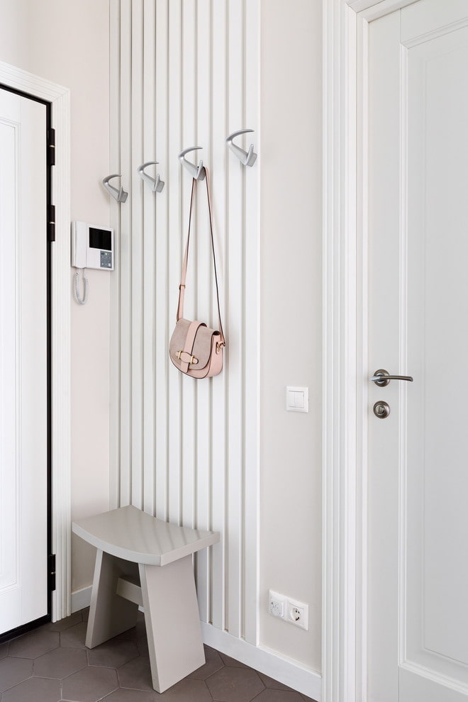 Shopping bags, handbags, school backpacks - putting them on the floor of the hallway is simply not hygienic. It is good if the role of a stand is played by a shoe rack or a bench with a soft seat, but if there is not enough space, separate hooks can be provided for bags at a suitable height.