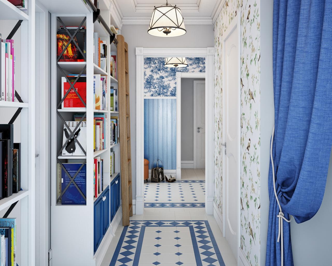 This color in the hallway is often used in combination with white, or as part of ornaments in muted tones: pink, burgundy.