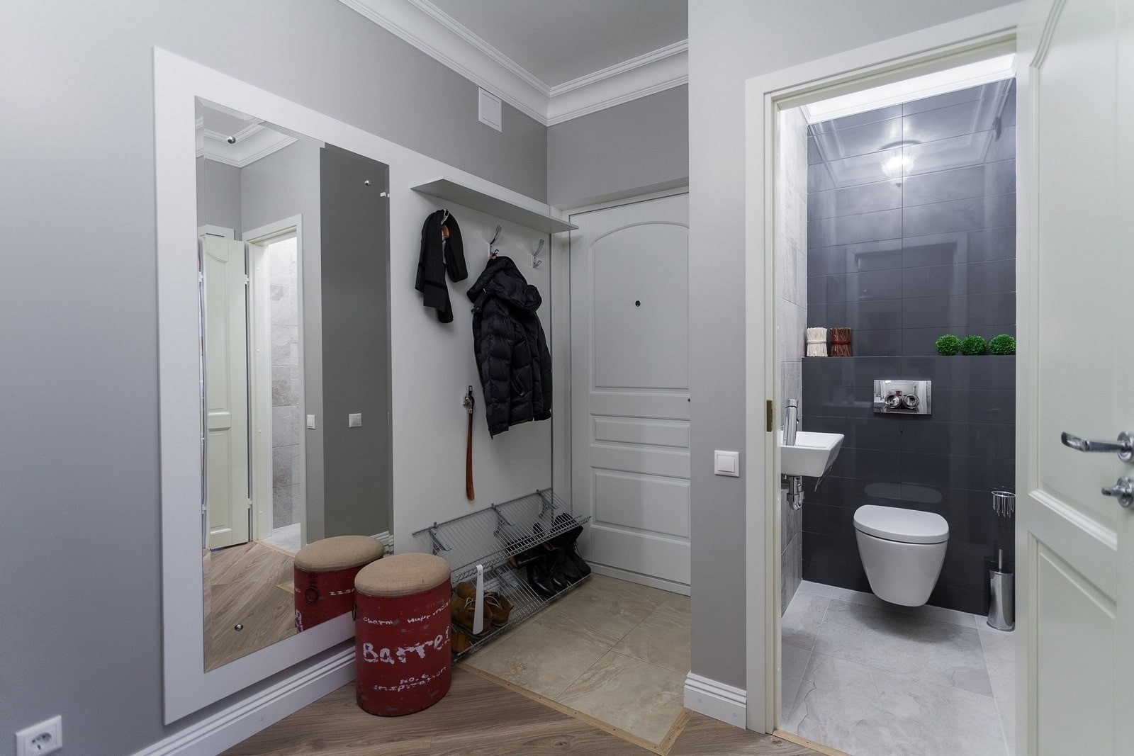 A simple interior rule that always works: the top is the lightest shade, the bottom is the darkest. This does not mean that the floors in the hallway should be black - a shade 2-3 tones richer than the walls is enough.