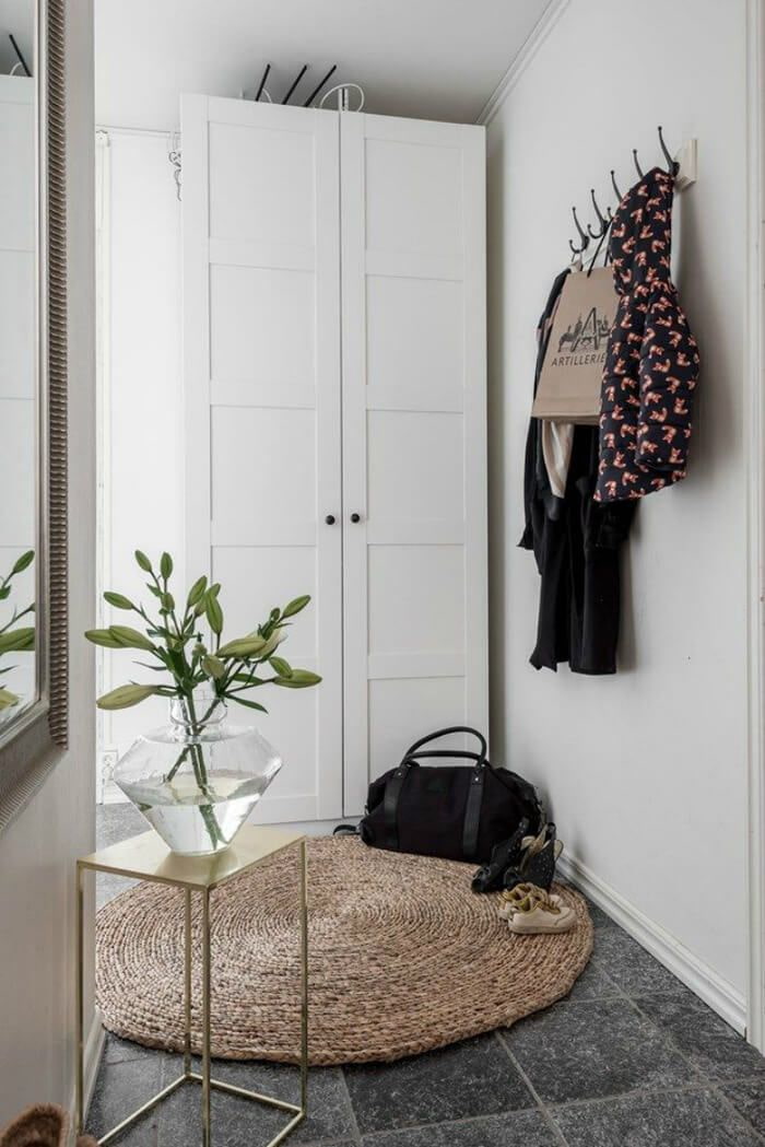 If you want to add aesthetics to the environment, avoid synthetic rugs in unnatural shades. Put a practical product with a hard pile outside the door to leave dirt from the soles outside, and place a multi-colored or wicker rug in the apartment.