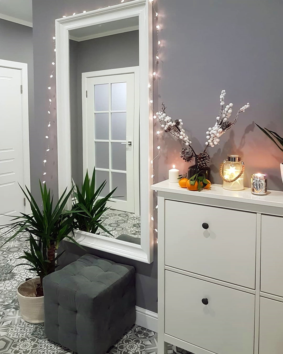 Change the light bulb to warm or cold depending on your preferences, hang garlands or decorate the entrance area with an interesting chandelier. Original lamps can be found on the Internet flea market or made with your own hands.