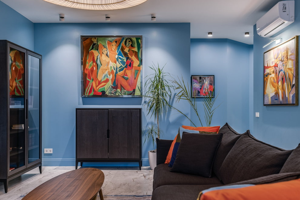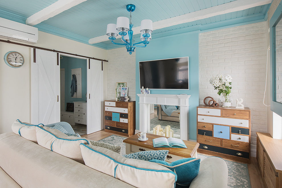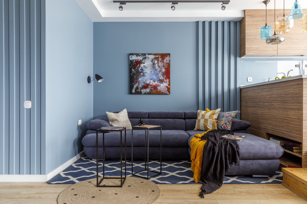 To create a warm and sunny atmosphere, it is appropriate to dilute the main azure blue color with yellow. Very profitable is the pink-blue tandem, which is associated with the crimson glow of the sunset against the background of a bright blue sky. This combination gives the living room additional contrast and at the same time gives lightness and tenderness.