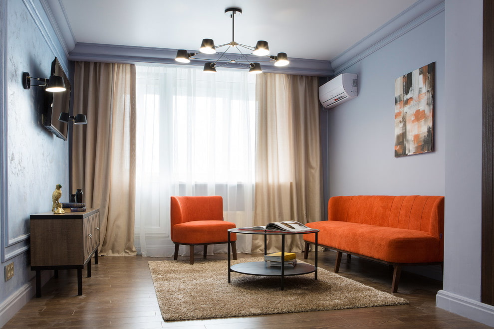 The photo shows the interior of a blue living room with orange upholstered furniture.