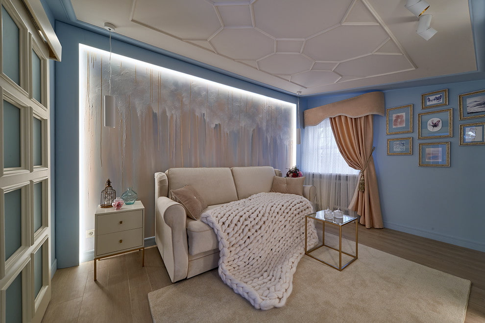 In the interior of the living room in blue, a classic white or milky ceiling will look best, which advantageously sets off the wall decoration and visually expands the room.
