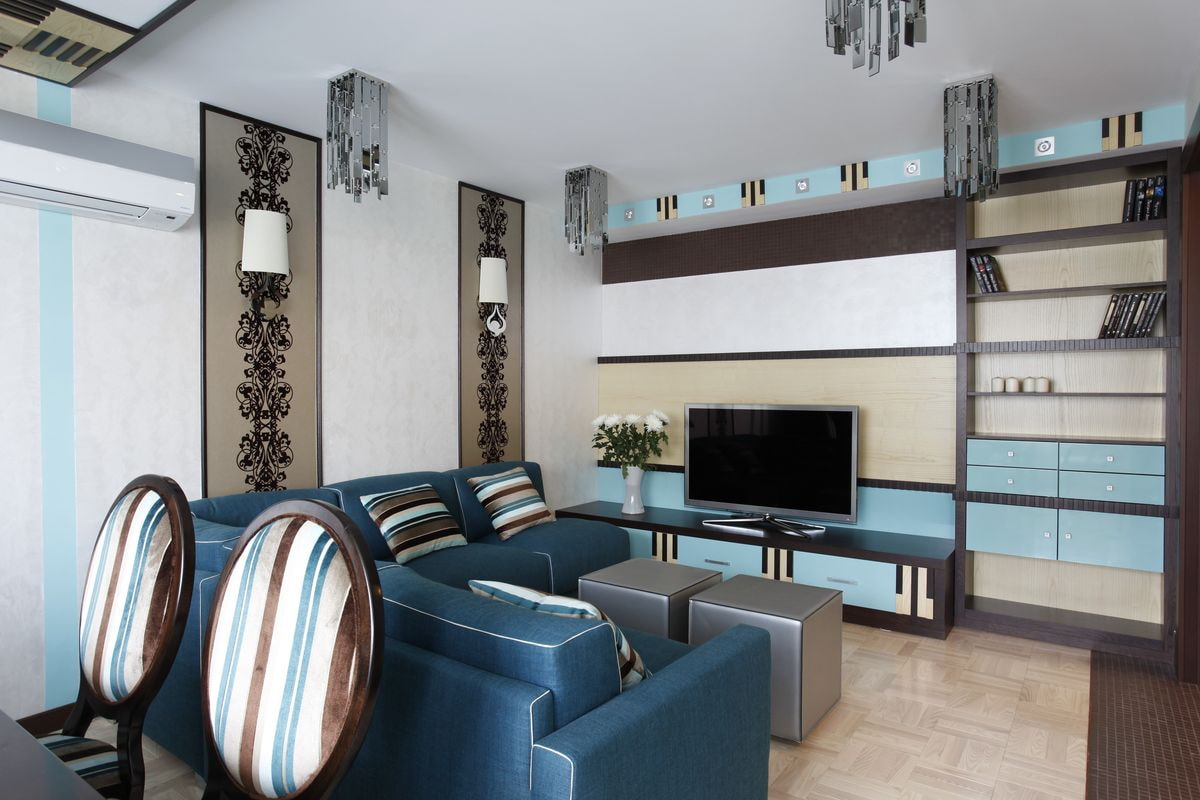 The presence of blue in the interior of the living room makes the room spacious, bright and spectacular. The hall, designed in such a shade range, is distinguished by refined elegance, luxury and certainly becomes the main decoration of an apartment or house.