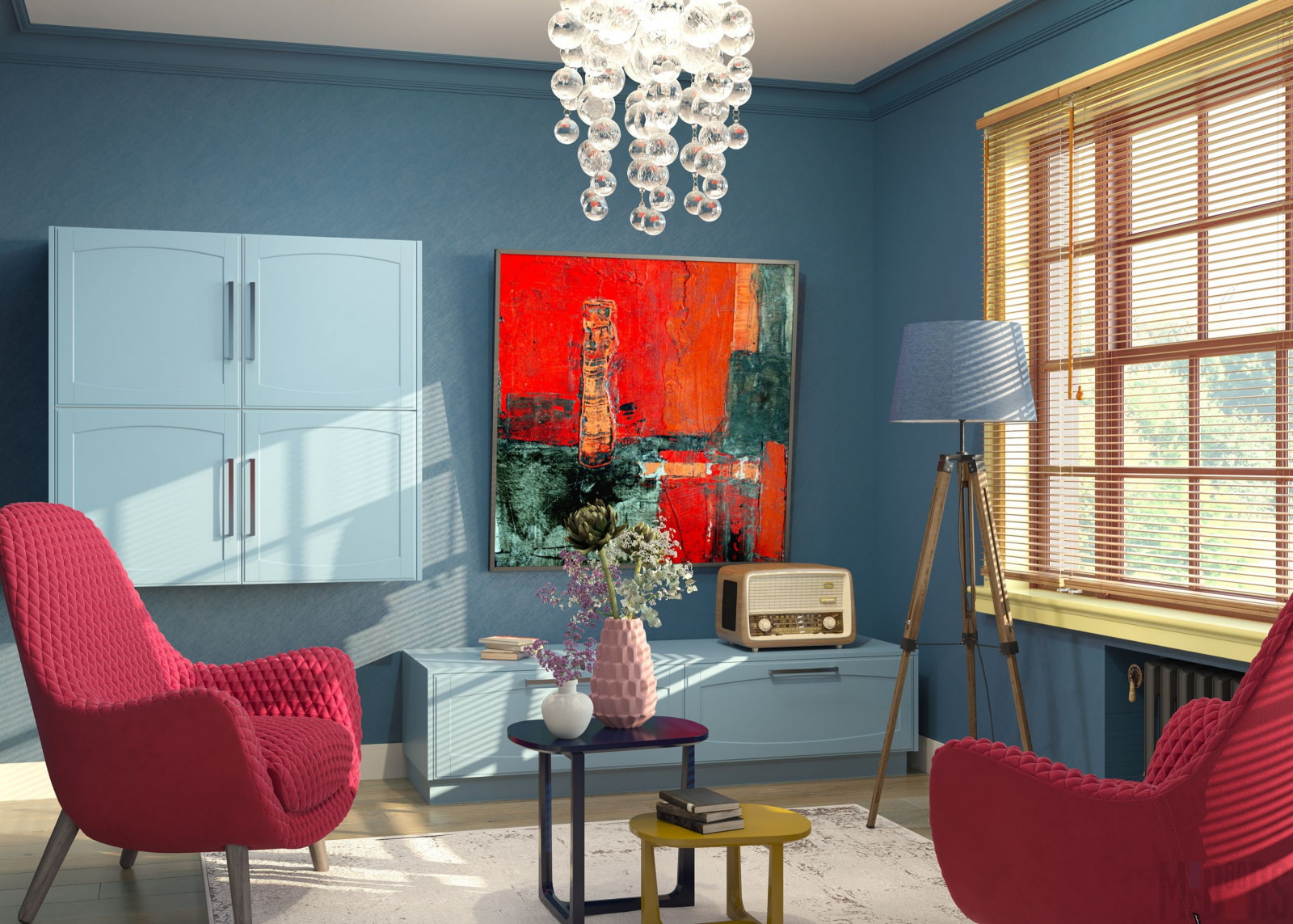 Since sky blue belongs to a cold shade range, furniture items in warm beige, brown, sand or milky colors are chosen for the hall. Soft headsets in red tones look great in a blue interior.