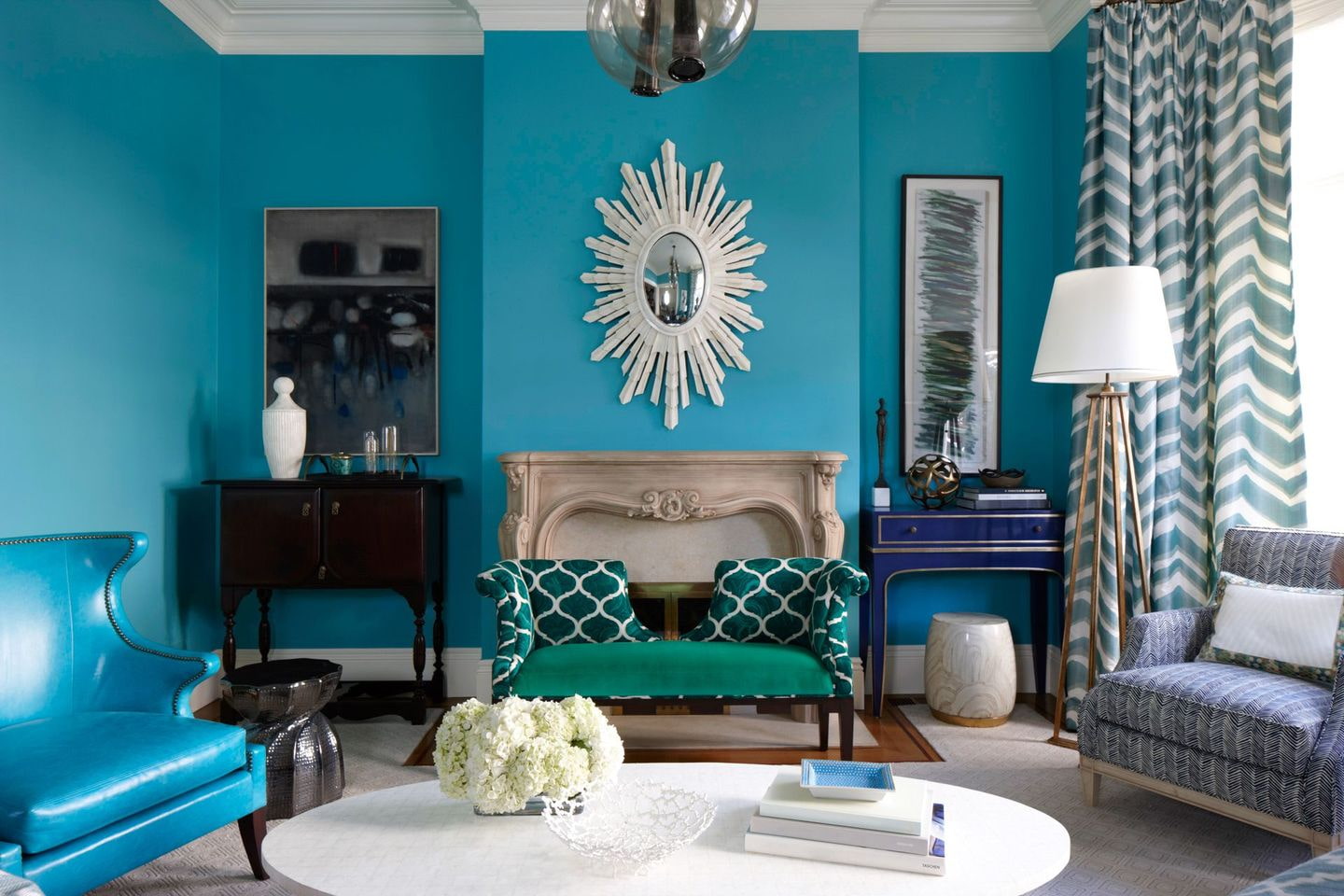 Blue or turquoise furniture will perfectly fit into a light blue room. For a living room designed in a deeper and more saturated color, a sofa and armchairs with gray, white or other discreet upholstery are suitable.