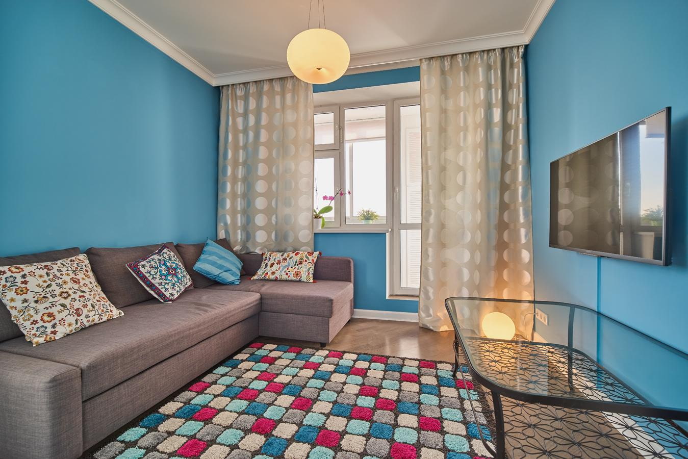 The photo shows the interior of the living room in blue, complemented by a bright rug and sofa cushions.